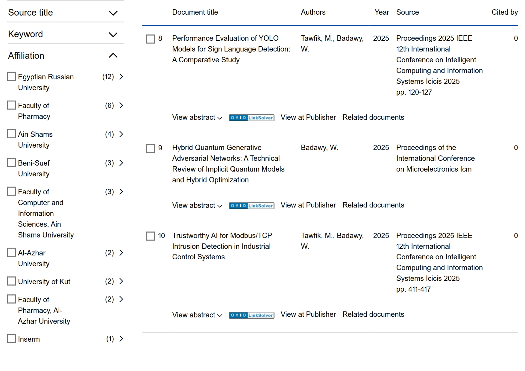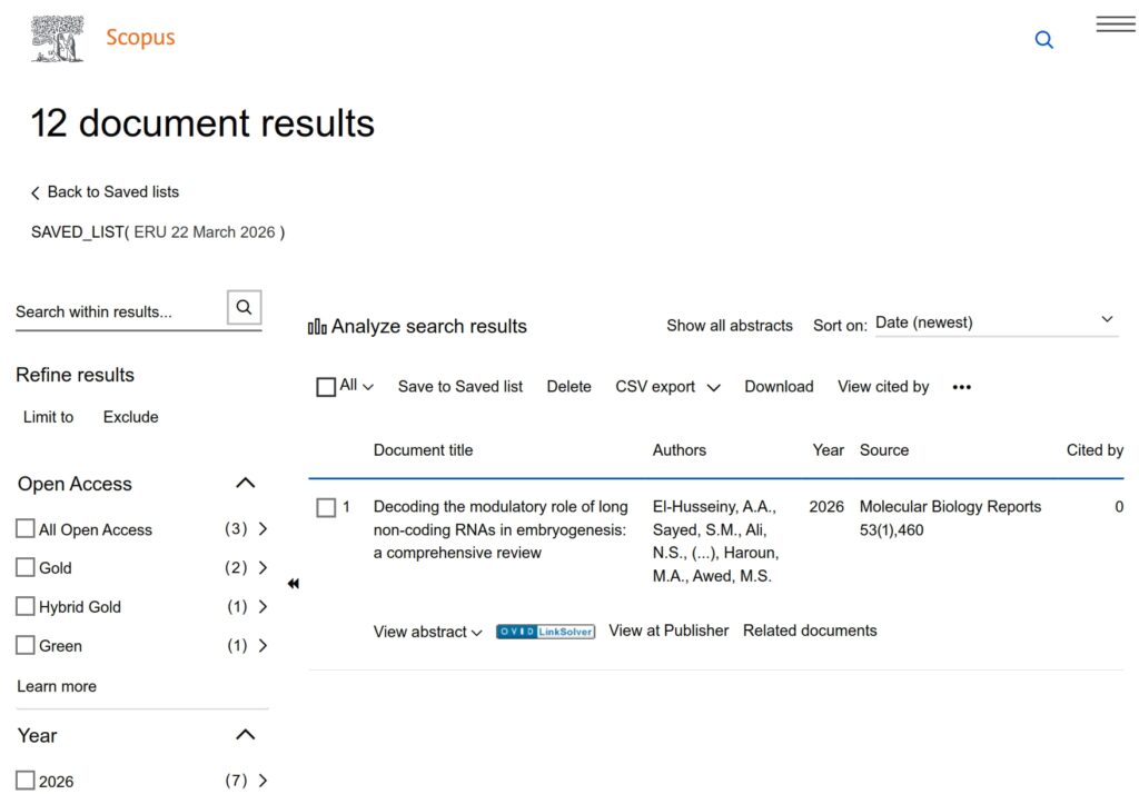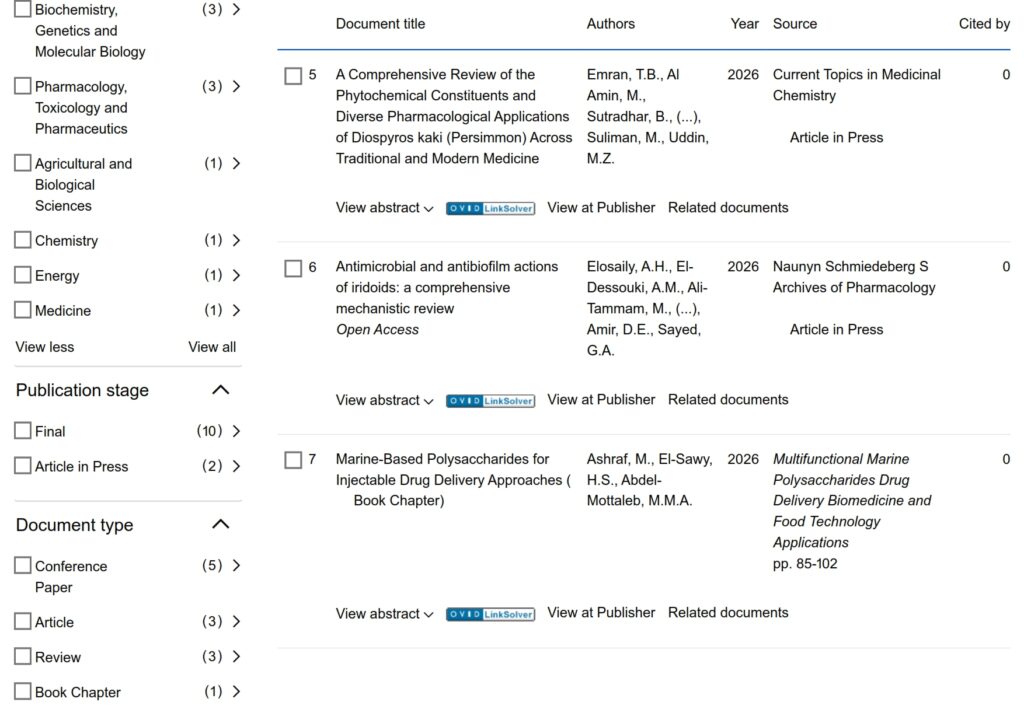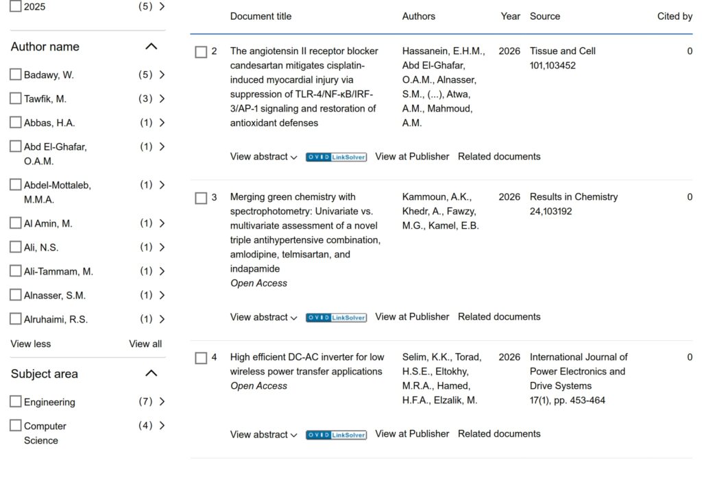 نشرت الجامعة المصرية الروسية 12 أبحاث في المجلات المفهرسة عالمياً على منصةScopus هذا الأسبوع بتاريخ 22 مارس 2026. وبالتالي أصبح إجمالي النشر العلمي للجامعة المصرية الروسية 1647 بحثاً، منهم 76 بحثاً في عام 2026، 385 بحث في عام 2025، و 276 بحث في عام 2024، و 249 بحث في عام 2023.