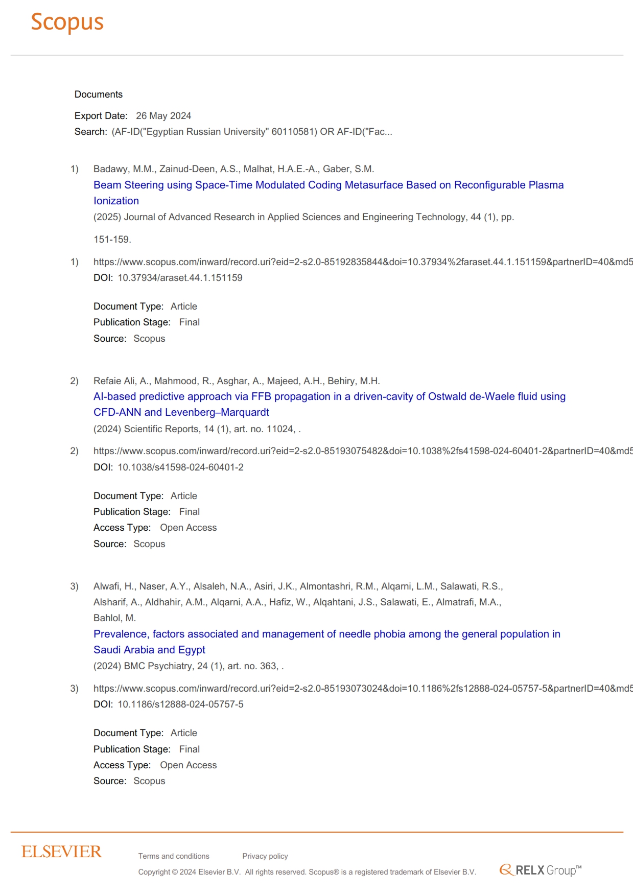 The Egyptian Russian University (ERU) has published this week ten research papers in globally indexed journals on Scopus Platform on May 26, 2024. So the total scientific publication by the ERU has amounted to 1,025 papers, of which one paper was published in 2025, 119 in 2024, and 243 ones in 2023.