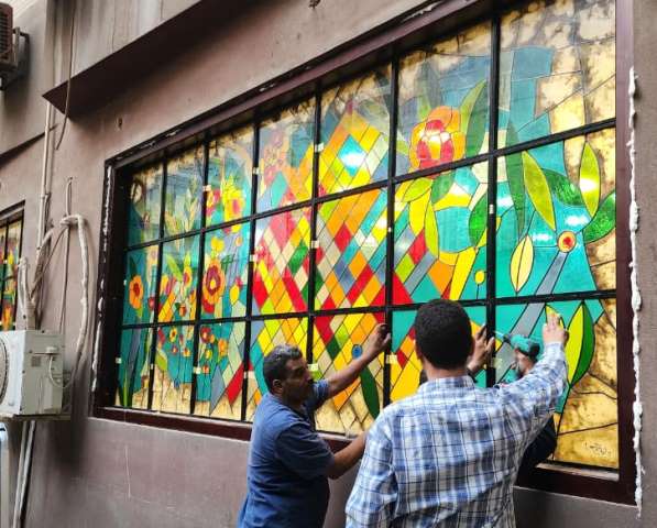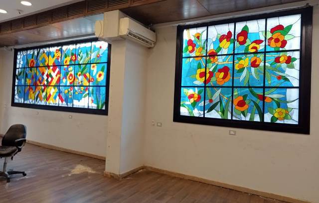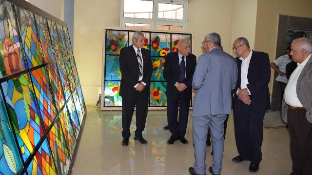 In the same context, Dr. Ezz El-Din Abdel Aziz Hassan, Dean of the Faculty of Applied Arts at the Egyptian-Russian University, explained that the total surface area of the artworks installed inside the Applied Arts Designers Syndicate building, in the four openings, is approximately 24 square meters. He noted that the design, execution, and installation of the artworks took ten months to complete, and the project was carried out in cooperation with Dr. Helmy El-Shanawany, Head of the Applied Arts Designers Syndicate, and Dr. Wagih Khedr, Secretary-General of the Syndicate.