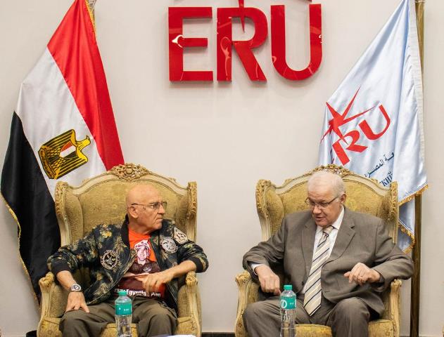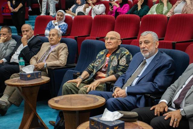 In his speech, Major General Pilot / Ahmed Al-Mansoury expressed his joy to be on the ERU campus and among its students for the fifth year in a row. He reviewed the honorable heroism of the Egyptian Air Force, of which he was one of the prominent heroes during the war period until victory, and how he was able to break the world records and the military aviation rules, to the point where his aerial battles and maneuvers, along with those of his fellow Egyptian Air Force eagles, became a source of appreciation among local and international military academies. He also spoke about his 52 sorties over 18 days during the October War, and how he successfully landed his broken-down plane on Zafarana Road. He also mentioned that he had received numerous medals, including the Medal of Courage, the Military Star Medal, and others.