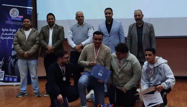 Dr. Tamer Saleh added that the events were attended by a number of academic leaders, guests, and sponsors, most notably: Dr. Alaa Al-Batsh, Dean of the Faculty of Engineering, Dr. Hesham Fathy, Dean of the Faculty of Artificial Intelligence at the ERU, Dr. Doaa Mohie-el-Deen from the Chinese University, and Engineer/ Ahmed Sobhy, Chairman of the Board of Directors of Free Electronics Company. After strong competition and multiple elimination rounds, the results were as follows: