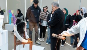 The Dean of the Faculty of Fine Arts explained that the exhibition was held under the supervision of Dr. Ahmed Mousa, lecturer of sculpture, and with the assistance of TAs: “Yomna Al-Sharif, Michael Wahid, and Zina Ahmed”.. Noting that ” Al- Kursy ” (the chair) is considered one of the most widespread design subjects, where the details of its purposes and basic function associated with humans and their life activities are multiple, and in addition to its direct content related to its apparent function, there are other moral connotations and implications that have prompted creators to address it as an expressive or symbolic subject, especially in modern and contemporary art. In the context of conceptual art, (the chair) has been aesthetically reinterpreted in many forms.