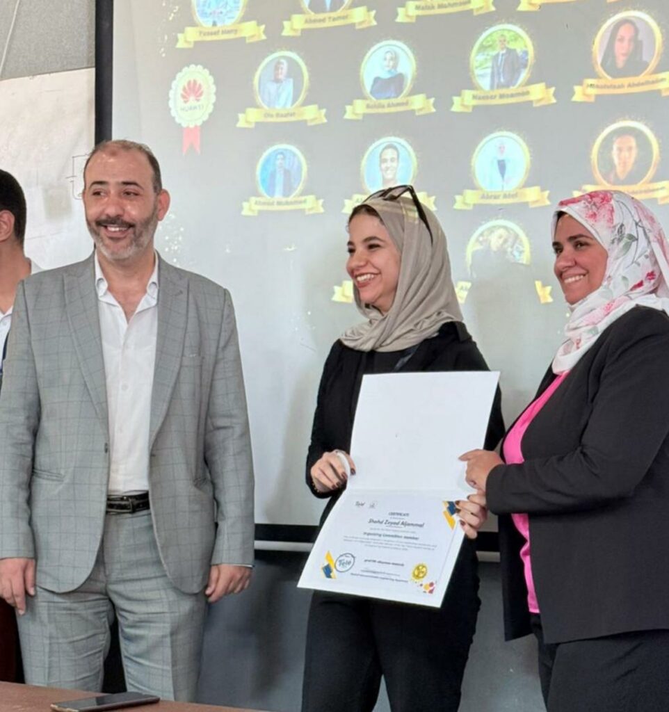 At the forefront of the activities was the “TeleTitans” Scientific Society for Communications, Electronics and Artificial Intelligence, under the supervision of Dr. Shaymaa Mustafa and Dr. Ahmed Hamdy. The students Fatima Ahmed and Khaled Farooqi gave a distinguished presentation on the society’s objectives and its diverse activities, which contribute to supporting students academically and practically, both within and beyond the university, and work to link theory with practice through innovative projects and workshops.