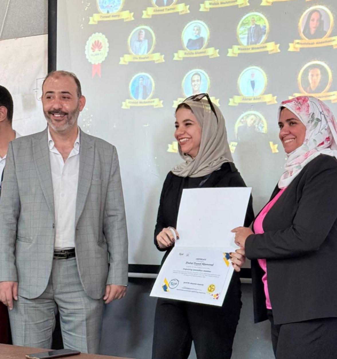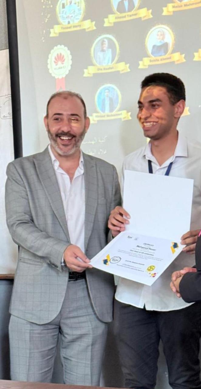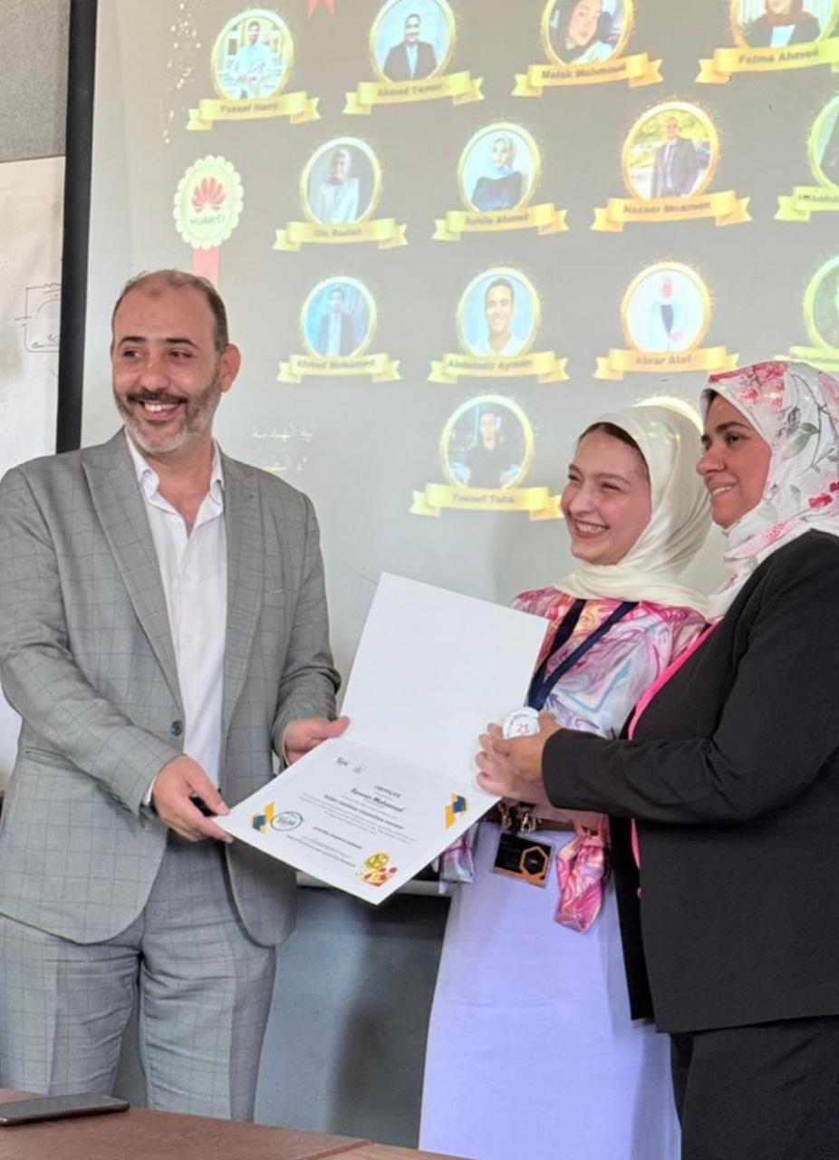 Huawei Academy’s activities were also reviewed under the supervision of Dr. Tamer Saleh, Academy’s Executive Director. The student Seif Al-Deen Wael gave a comprehensive presentation on the Academy’s training programs and global competitions, highlighting its role in qualifying students to obtain professional certifications in the field of networks and communications. This has helped many university students achieve advanced positions locally and internationally.