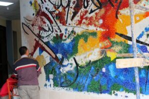 Students of Applied Arts at the Egyptian Russian University create a mosaic glass mural...