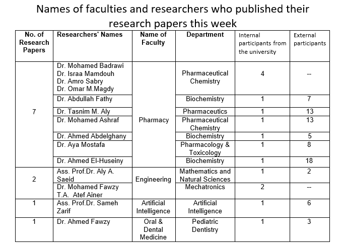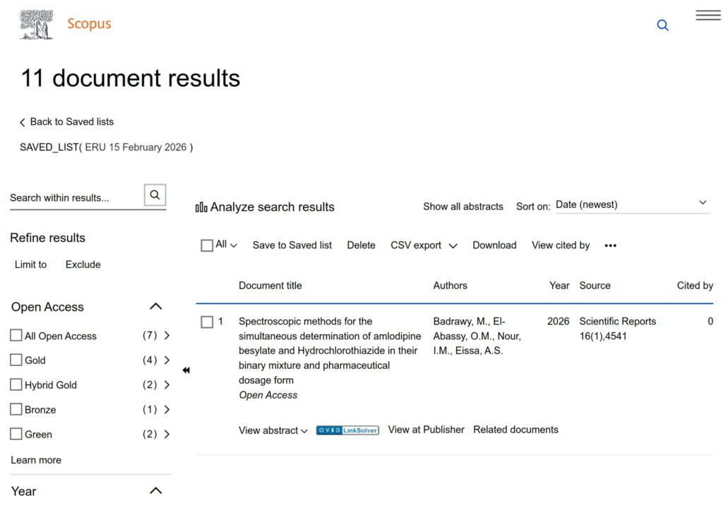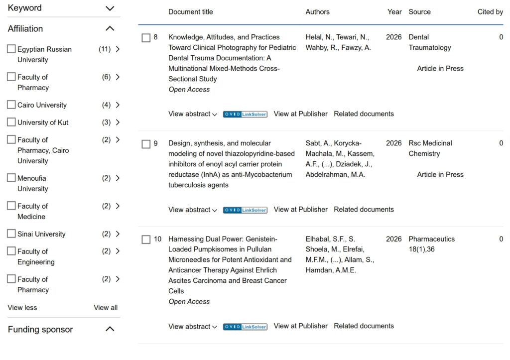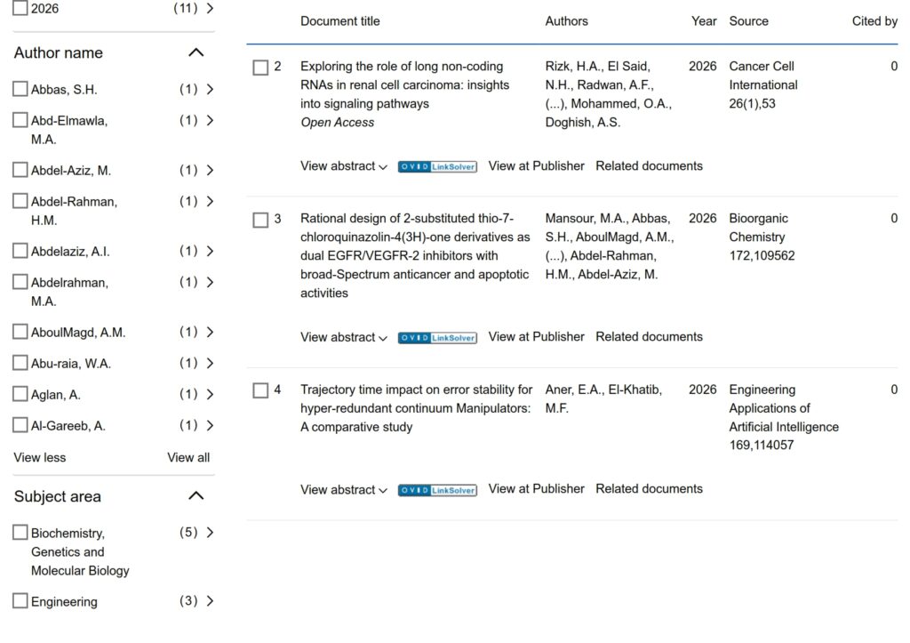 The Egyptian Russian University (ERU) has published this week 11 research papers in globally indexed journals on Scopus Platform on February 15, 2026. So the total scientific publication by the ERU has amounted to 1,615 papers, of which 46 papers was published in 2026, 383 papers was published in 2025 and 276 in 2024 and 249 in 2023.