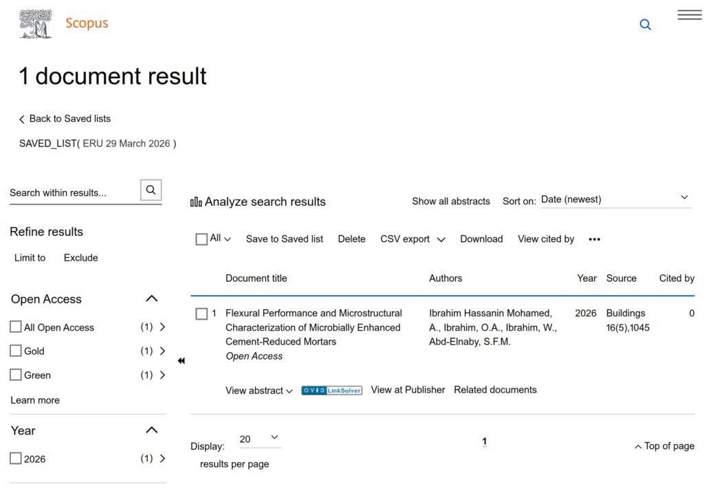 The Egyptian Russian University (ERU) has published this week one research paper in globally indexed journals on Scopus Platform on March 29, 2026. So, the total scientific publication by the ERU has amounted to 1,648 papers, of which 76 papers was published in 2026, 386 papers was published in 2025 and 276 in 2024 and 249 in 2023.