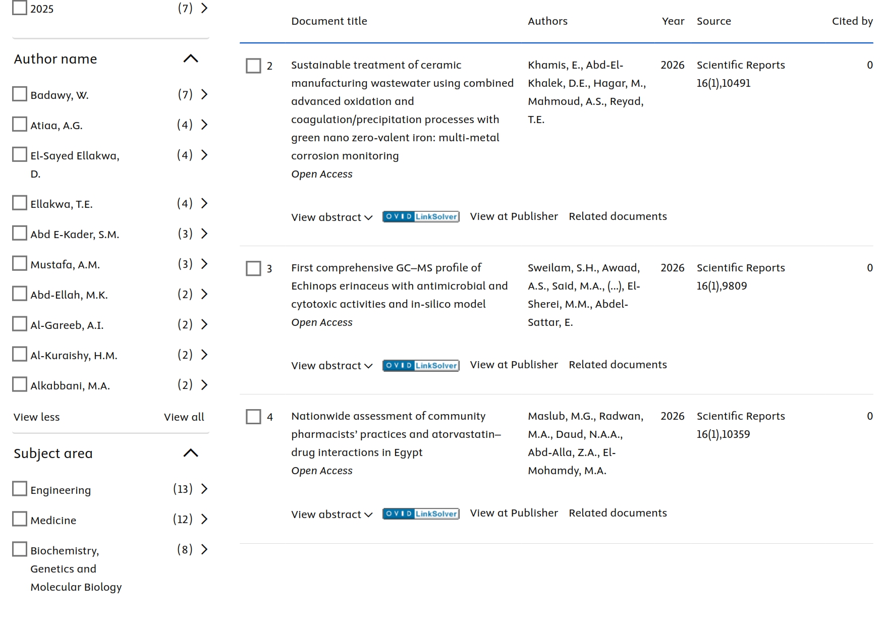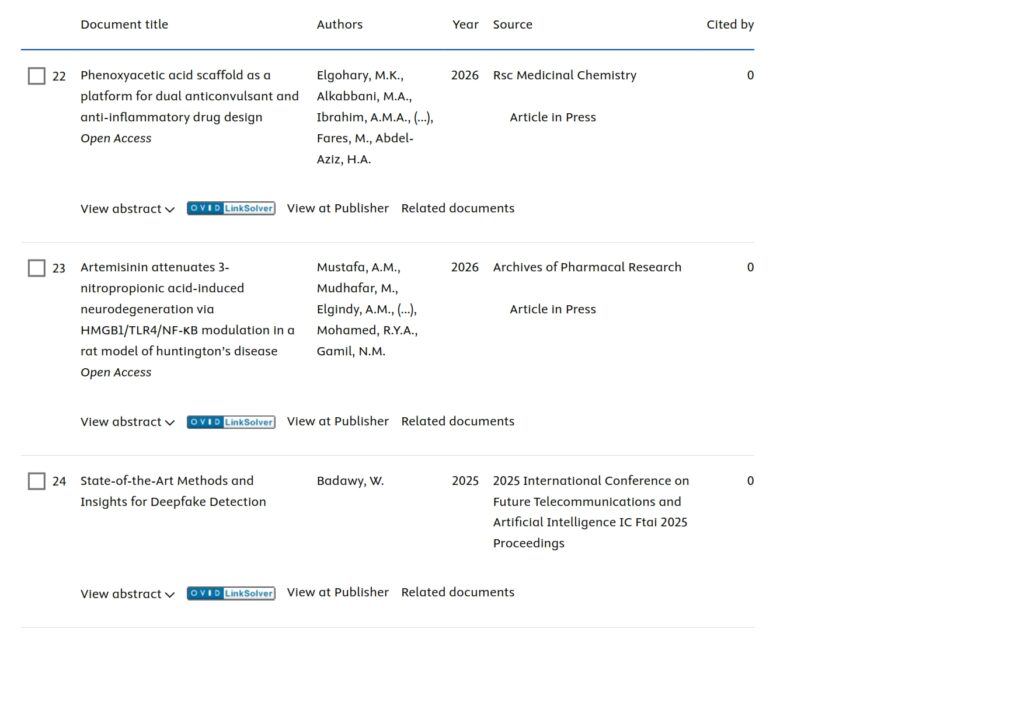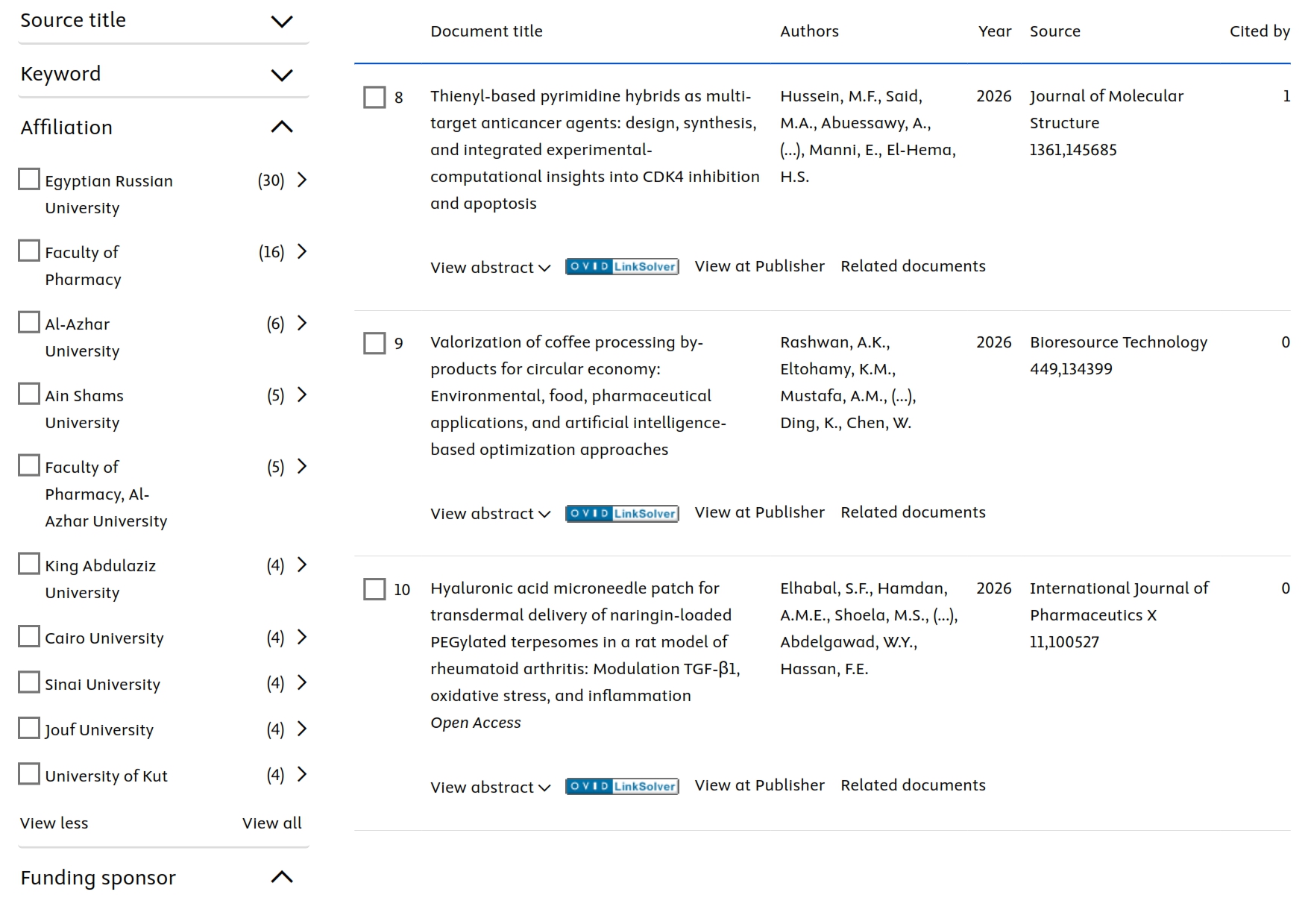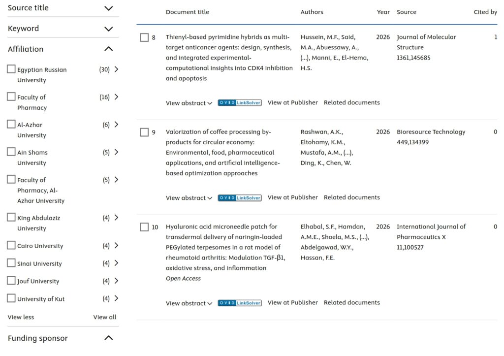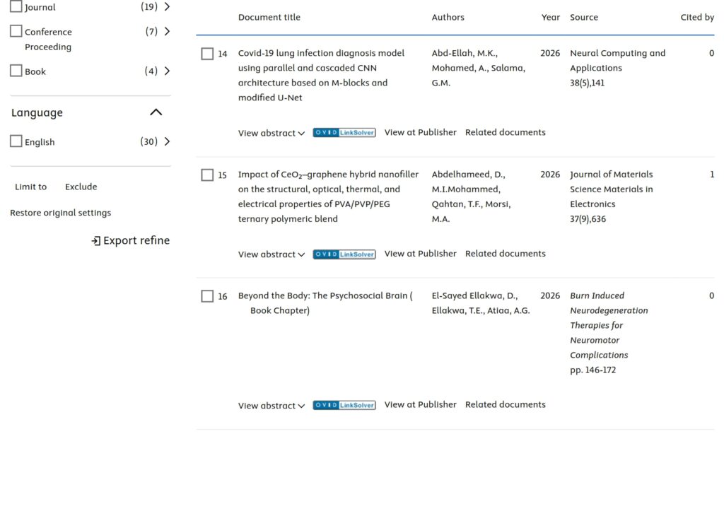 The Egyptian Russian University (ERU) has published this week (30) research papers in globally indexed journals on Scopus Platform on April 19, 2026. So, the total scientific publication by the ERU has amounted to 1,683 papers, of which 105 papers was published in 2026, 393 papers was published in 2025 and 275 in 2024 and 249 in 2023.