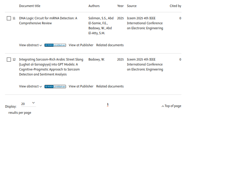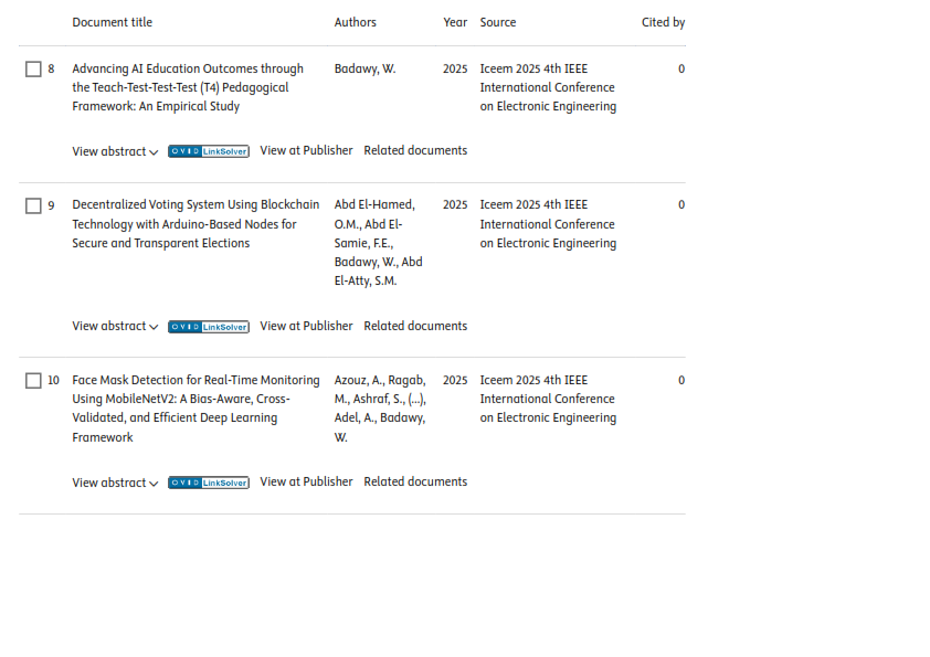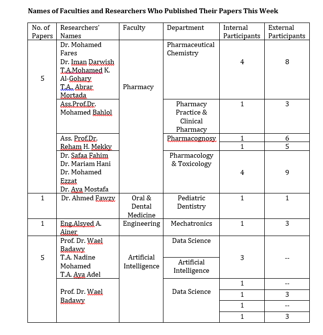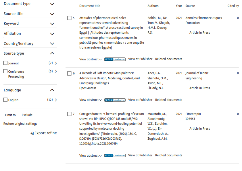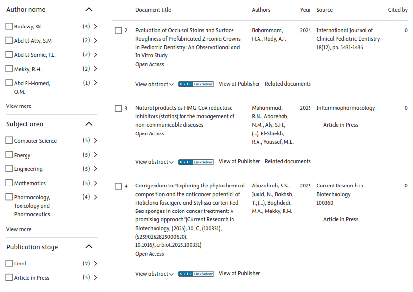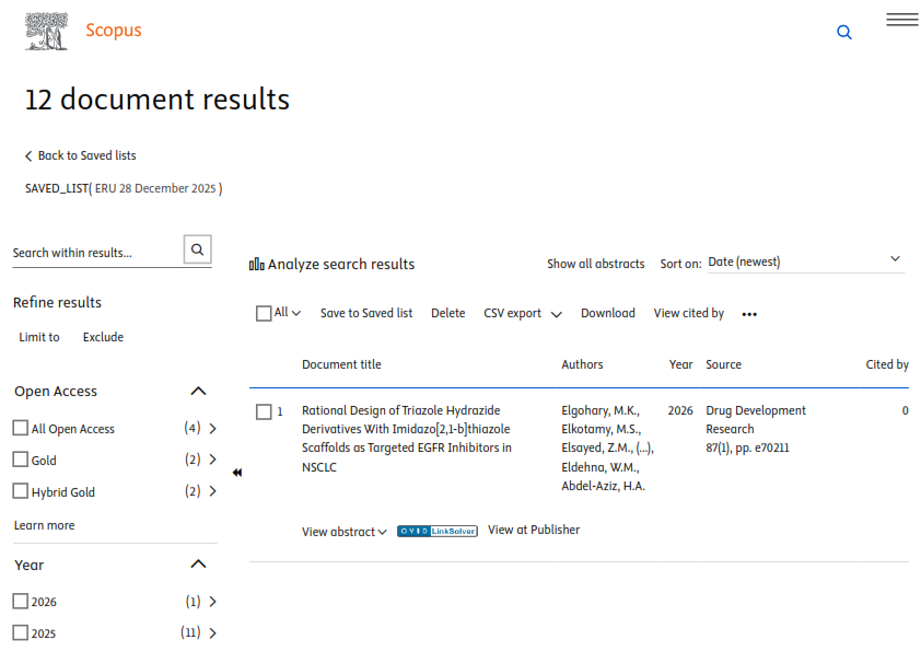 The Egyptian Russian University published sixteen (12) research papers in internationally indexed journals on the Scopus platform this week, dated December 28, 2025. Accordingly, the total number of publications of the Egyptian Russian University has reached 1,573 papers, including 12 papers in 2026, 375 in 2025, 276 papers in 2024 and 249 papers in 2023.