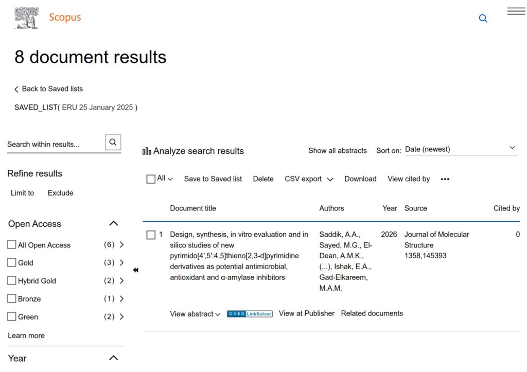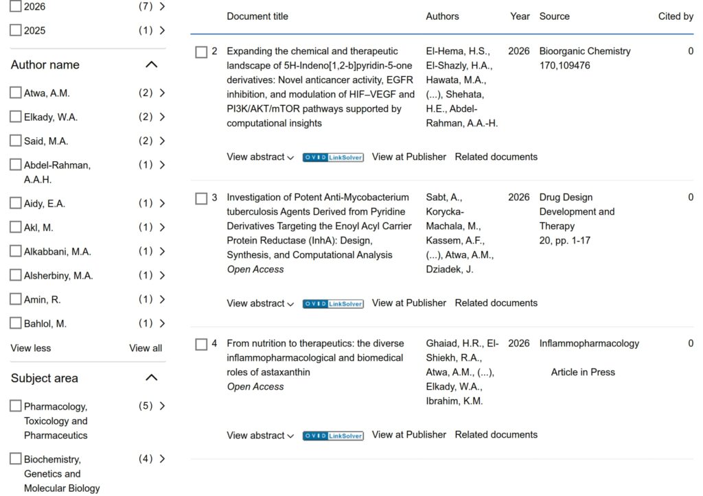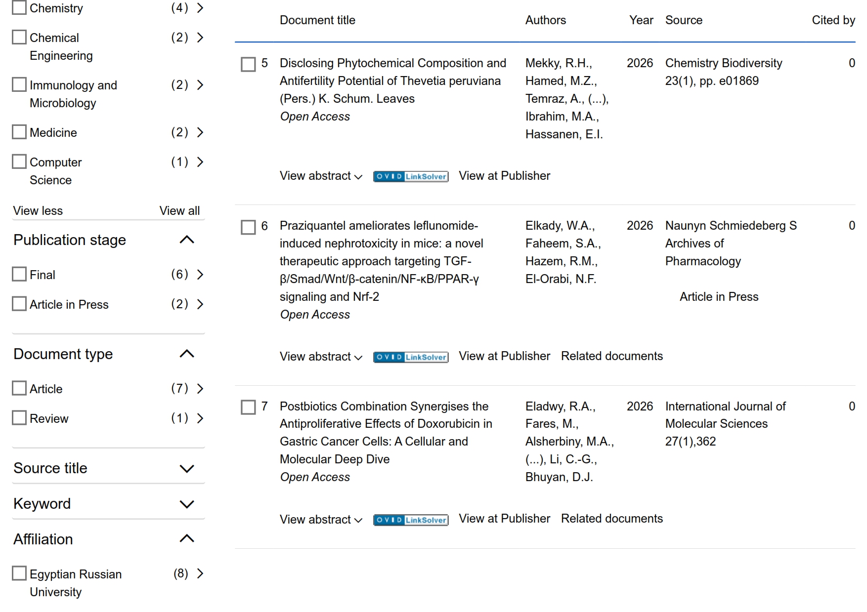 The Egyptian Russian University published (8) research papers in internationally indexed journals on the Scopus platform this week, dated January 25, 2026. Accordingly, the total number of publications of the Egyptian Russian University has reached 1,592 papers, including 22 papers in 2026, 384 in 2025, 276 papers in 2024 and 249 papers in 2023.